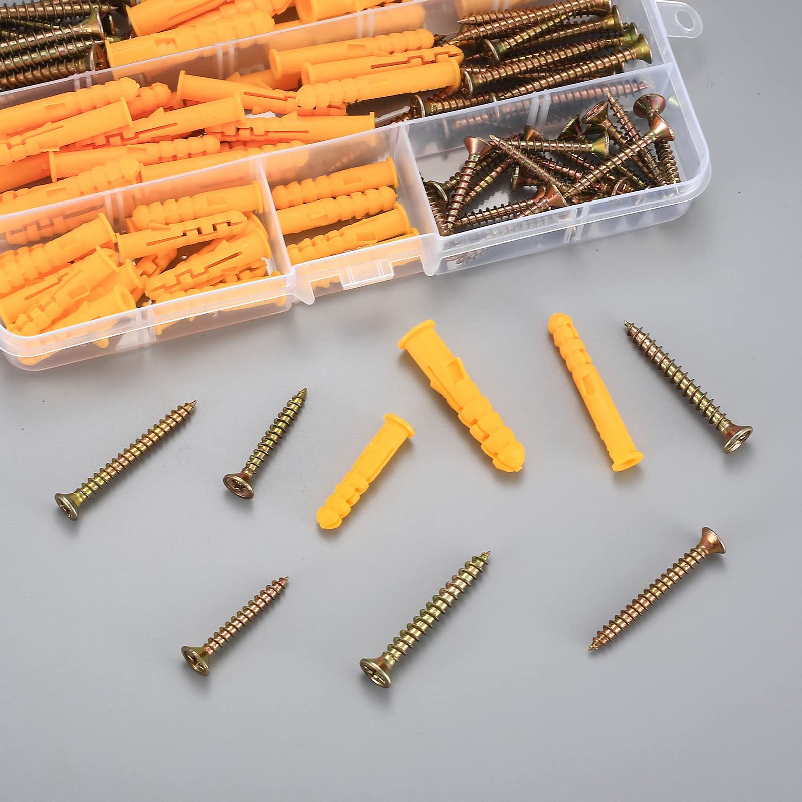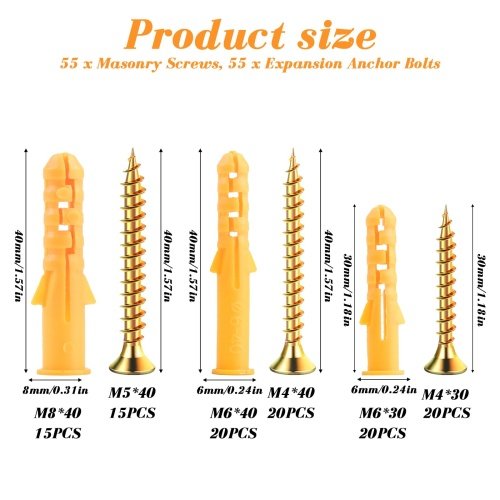 - Package Includes: You will get 55 pcs yellow extension wall plugs and 55 pcs matching self-tapping screws, 3 sizes of M6*30 mm/M6*40 mm/M8*40 mm. Can be used for solid bricks, concrete, lime-sand bricks, high-pored bricks, and other wall materials.