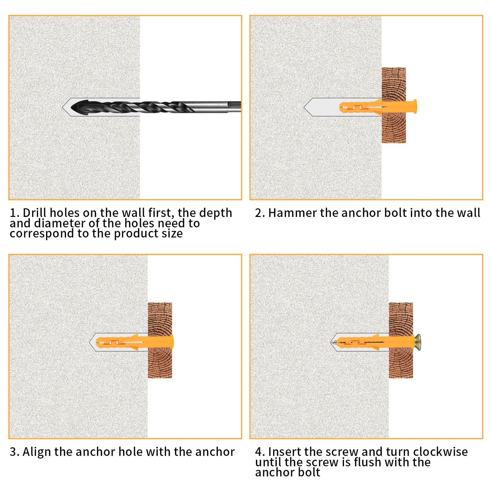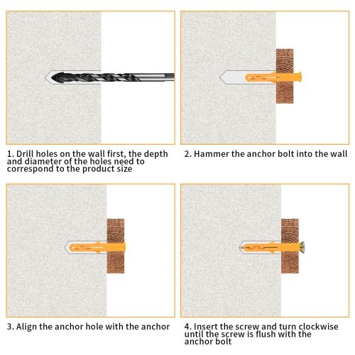 - Easy to Use: Just use a drill to drill holes at the marked points, then hammer the wall anchor into the hole, place the fixing parts, and finally use a screwdriver to screw the self-tapping screw into the wall anchor for fixing.