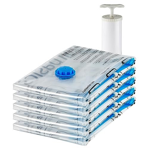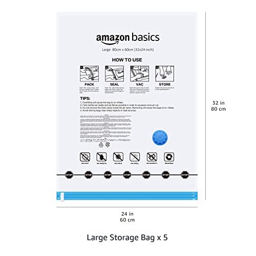 Amazon Basics Vacuum Compression Zipper Storage Bags with Airtight Valve and Hand Pump, Large, 5-Pack, Clear