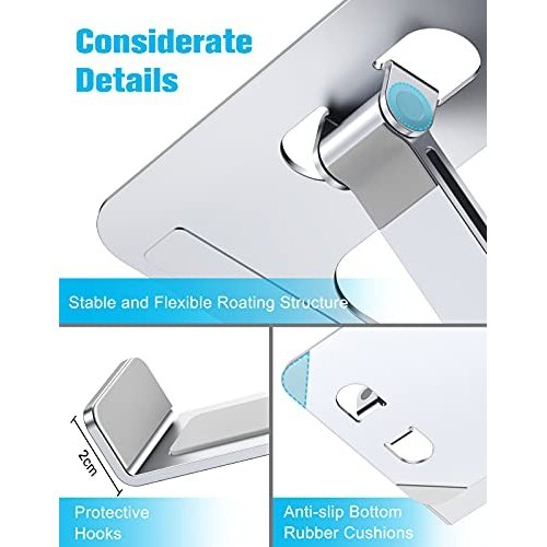 - 【Stable & Sturdy】The laptop stand for desk is made of high-quality aluminum alloy. It can support up to 8.8 lbs (4 kg) without shaking the panel. The panel and its two hooks are designed with non-slip straps to make the laptop holder more stable, and 4 non-slip silicone pads at the bottom help prevent the computer riser from sliding. These considerate designs are to ensure you better use.
