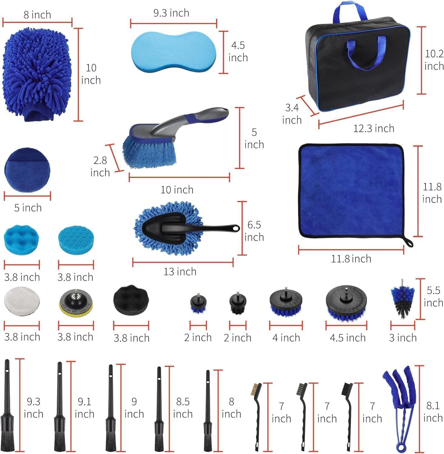 - ①29PCS car detailing kit: Detailing Brushes*5,Drill Brush Set*5,Wire Brushes*3,Drill Polishing Sponge Pad*3,Car Washing Towel*2 ,Air Conditioner Outlet Brush*2,Wax Applicator*2,Imitation Wool Pad*1,Car Wash Mitt*1,Car Wash Sponge*1,Suction Cup*1,Durable Storage Bag*1,Dust Brush*1,Tire Brush*1. The car detailing kit is complete with tools that can basically meet all your car washing needs.