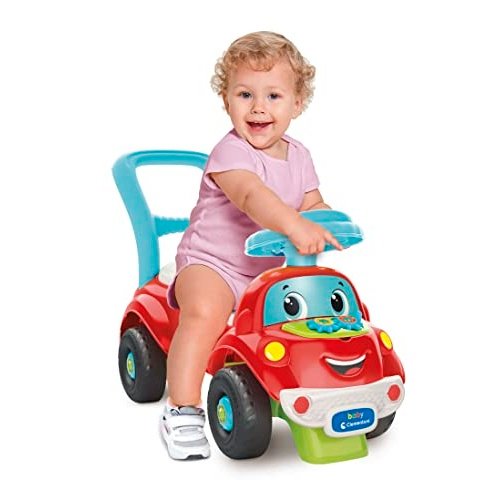 Nicolò Go Go is a Baby Clementoni car with unique design with 3 different functions: ride, first steps and activity center. This ride-on car is designed down to the smallest detail, with steering wheels, anti-tip systems and soft rubber bumpers to be ergonomic, safe and comfortable. The steering wheel is electronic, interactive, talking and musical that thanks to many sounds and songs, captures the child’s attention and stimulates curiosity and hearing. Pressing the key will activate the “realistic” mode with realistic sound effects of a real car horn to stimulate imagination and imitative play. Many mechanical activities: the gear to turn to “repair the engine” and the moulds to be inserted and retrieved from the opening trunk, support the psychomotor development and dexterity of the child. Made in Italy