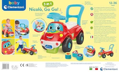 Clementoni 17747 Nicolò Go 3 in 1-Ride-on Car, Electronic Talking Educational, First Steps, Lights and Sounds, Children Play 1 Year-Made in Italy, Multi-Coloured, 57.5 x 19.5 x 35 centimetres