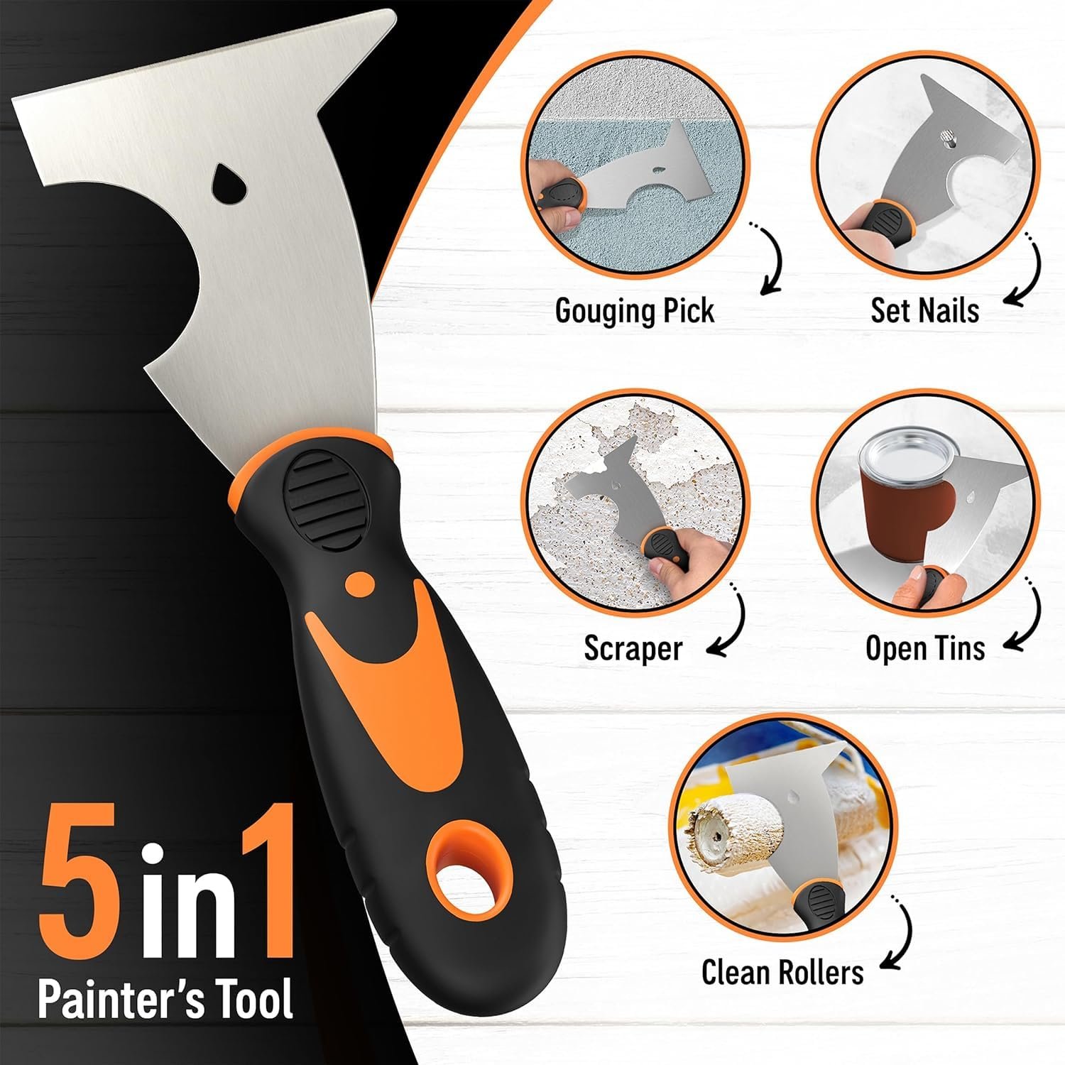 - 5-IN-1 MULTITOOL FOR MULTIPLE USES: The set includes a versatile painter’s multitool that can function as a putty knife, wallpaper scraper, or even a paint scraper. It’s perfect for opening cans, cleaning paint rollers, pulling nails, and more, making it an essential tool for any DIY job.