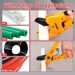 - WIDE APPLICATION: The tip blade can help cut all kinds of plastic pipes and pipes such as PVC, CPVC, PP-R, PEX, PE, hose, etc. The maximum opening size of 64mm (2 1/2 Inch) O.D. for a variety of environments and pipe size requirements. Pipe cutter is suitable for plumbers, assemblers and mechanics in plumbing, heating systems and factory engineering.