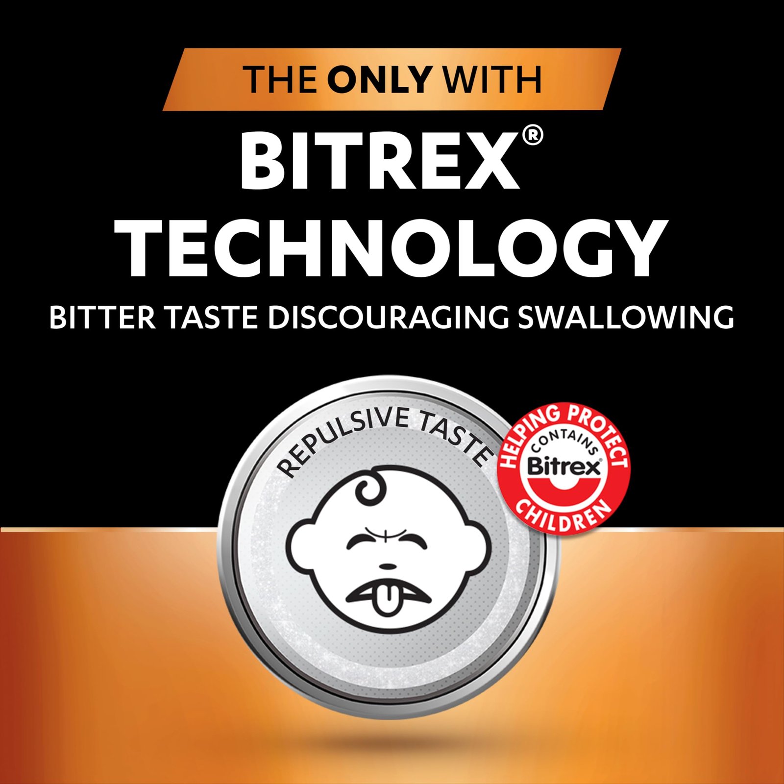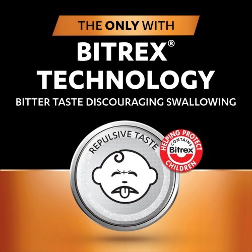 - BABY SECURE TECHNOLOGY: A non-toxic bitter taste ring-shaped layer with Bitrex applied on the back side of the cell to discourage swallowing by babies and toddlers.