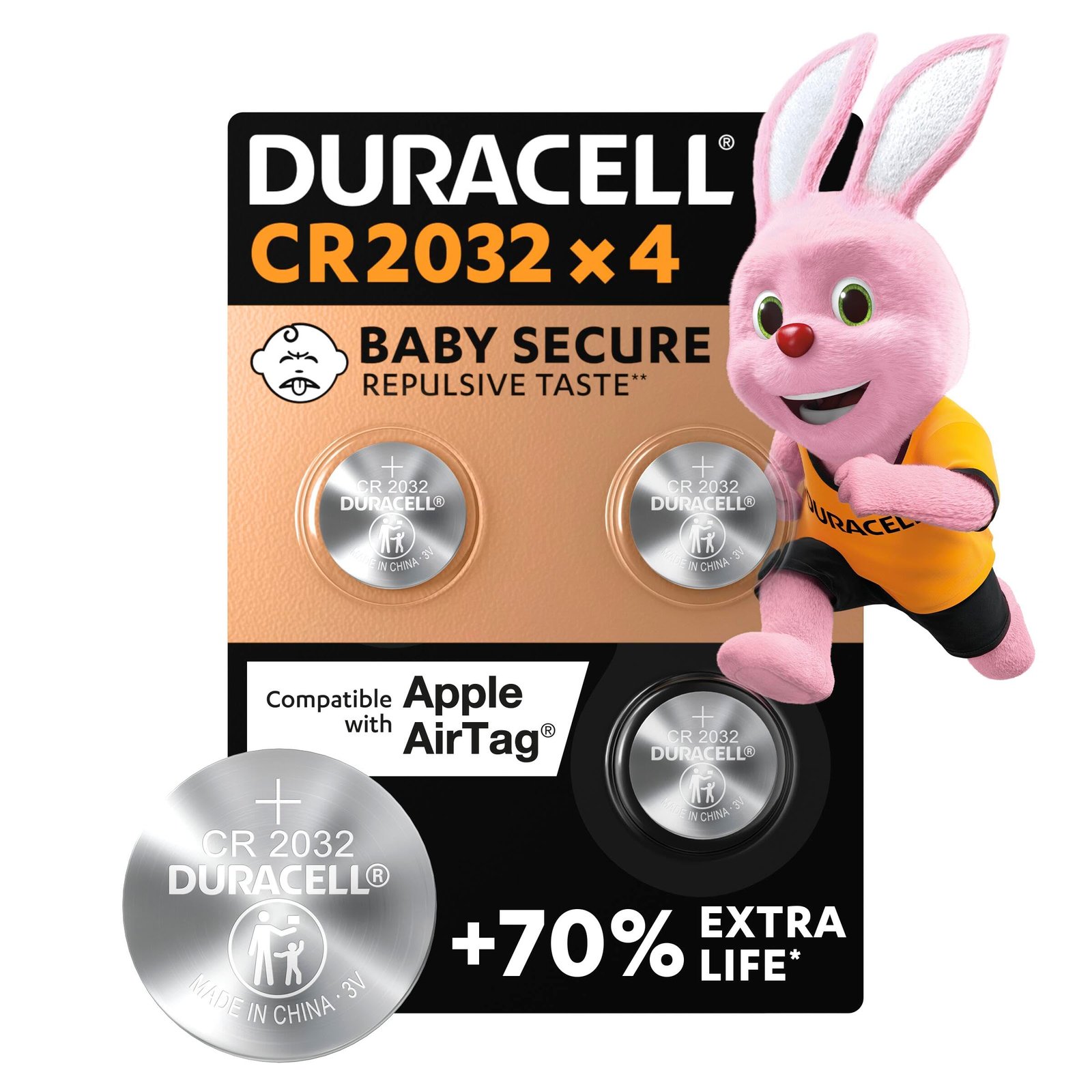 Duracell CR2032 Lithium Coin Batteries 3V (4 Pack) – Up to 70% Extra Life* – Baby Secure Technology – Recommended for use in Apple AirTag – Use in Key Fobs, Home Devices, Fitness, Medical Accessories