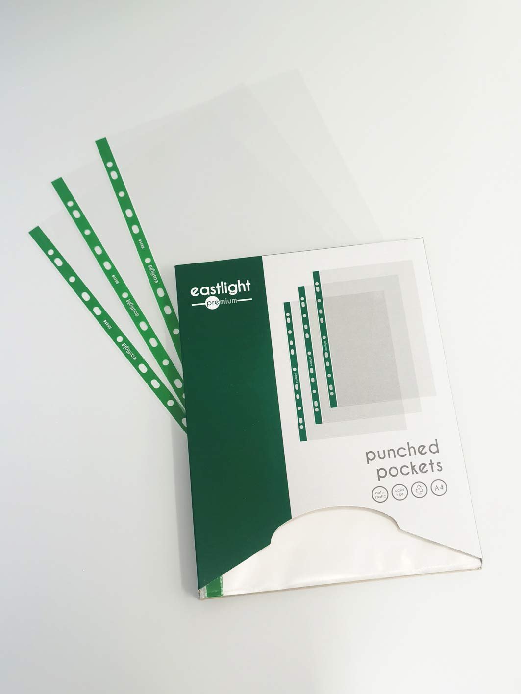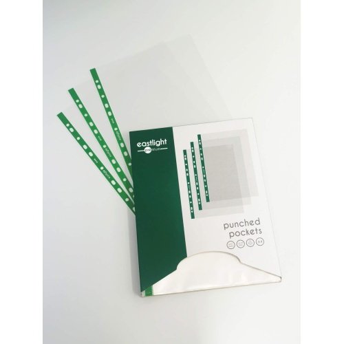Details: Eastlight A4 strong polypropylene punched pockets, 55 micron, glass clear finish for the easy viewing of documents, photographs or presentations stored inside. These pockets have a reinforced multi-punched spine designed to last, will fit most Lever Arch and Ringbinder files. Packed in a dispenser box for easy access. Box contents: 100 punched pockets