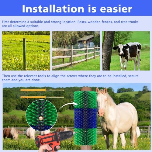 - 【Easy Installation】No need to worry about the tools for setup, we’ve got you covered,it can be easily installed in your corral, Iron Column, or outdoors, and is very strong (also for walls).Our back scratcher brush comes with an ample number of screws and nuts.These livestock scratch brushes can be willingly installed in various places at the barn, outdoors, on posts, poles, or walls. With both ease and security in mind, you can set up these cow scratcher brush with minimum labor.