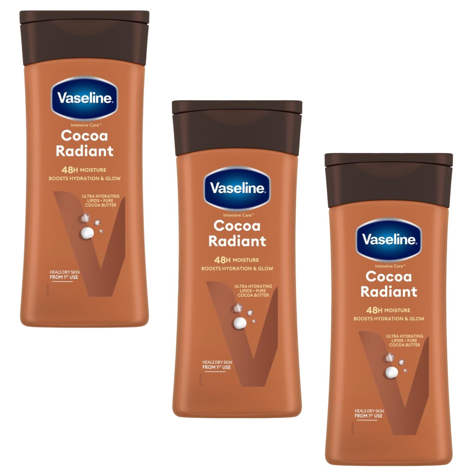Intensive Care Cocoa Radiant Body Lotion (200ml, Pack of 3) is the ultimate solution for dry skin in need of deep hydration and long-lasting moisture. Infused with a rich blend of cocoa butter and Vitamin E, this luxurious body lotion is designed to nourish and restore your skin, leaving it feeling soft, smooth, and beautifully radiant. The unique formula works deep within the skin’s surface, helping to heal and repair dry, rough patches, and lock in moisture for up to 24 hours. Ideal for daily use, the lotion absorbs quickly into the skin without leaving a greasy residue, providing a non-stop moisturizing experience throughout the day. The natural fragrance of cocoa offers a pleasant, subtle scent that lingers gently on the skin, making it feel refreshed and rejuvenated. Whether you have dry skin or simply want to keep your skin moisturized and glowing, Vaseline Intensive Care Cocoa Radiant Body Lotion is the perfect choice for all skin types. With the added benefit of a convenient 3-pack, you can enjoy continuous hydration wherever you go—whether at home, at work, or on the go. Pamper your skin with this rich and indulgent body lotion, and experience the soft, smooth, and radiant skin you’ve always desired. Perfect for both men and women, it’s the ultimate skincare solution for healthier-looking, nourished skin every day. This set of 3 convenient 200ml bottles ensures that you have the perfect size to use at home, carry in your bag, or keep in your office. The formula is dermatologist-tested, gentle on skin, and suitable for all skin types, including sensitive skin. Whether you’re looking to tackle dry patches or simply maintain your skin’s hydration and radiance, Vaseline Intensive Care Cocoa Radiant Body Lotion delivers the care your skin deserves. With regular use, you can enjoy healthier, more vibrant skin that looks and feels its best, every day. Perfect for both men and women, it’s the ideal choice for anyone looking for soft, smooth, and glowing skin.
