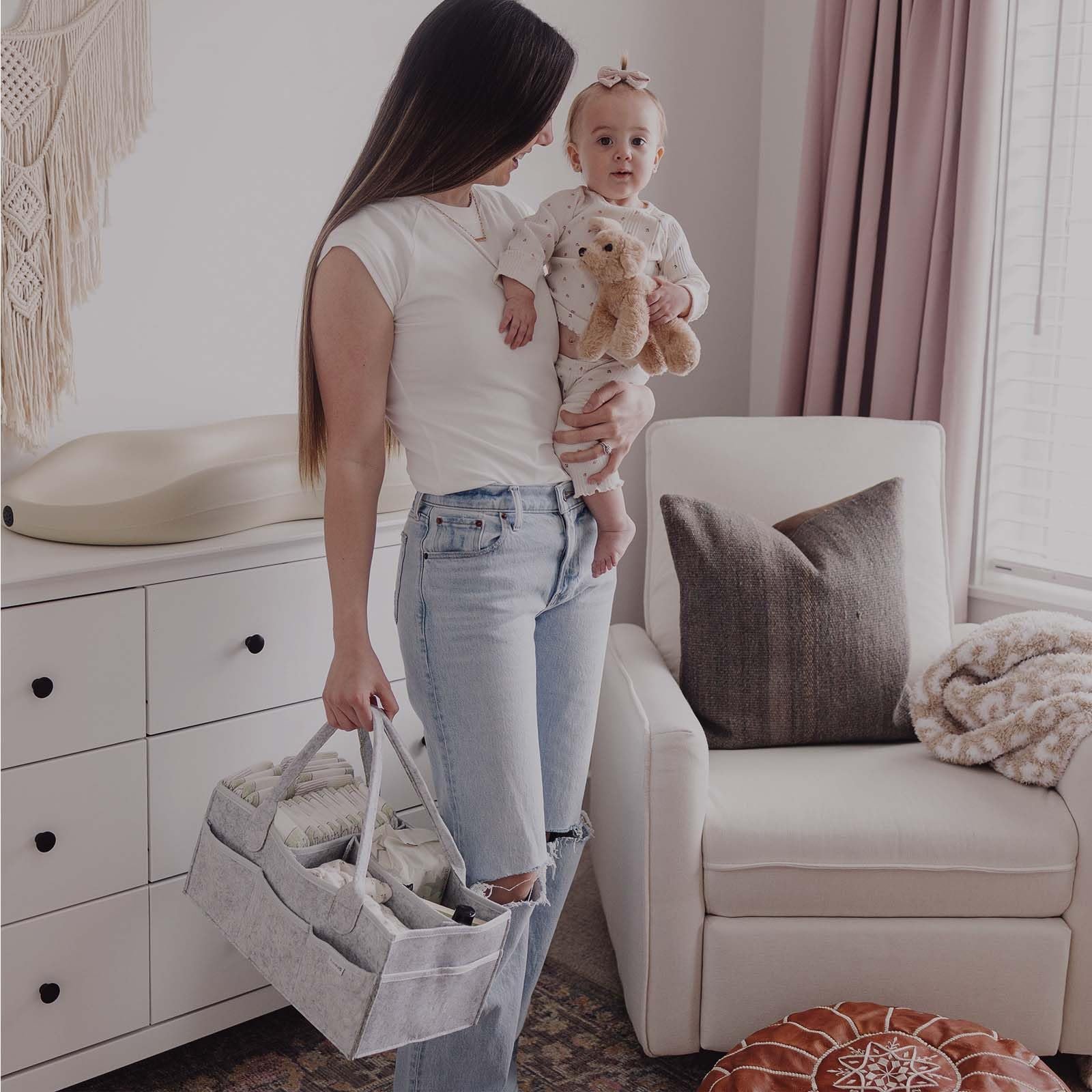- STYLISH BABY ROOM DECOR ITEM – Our 15x9x7 storage caddy organizer has plenty of space for all your newborn essentials you need close by. The versatile nursery organizer diaper stacker diaper caddy has 8 external pockets and 3 compartments.