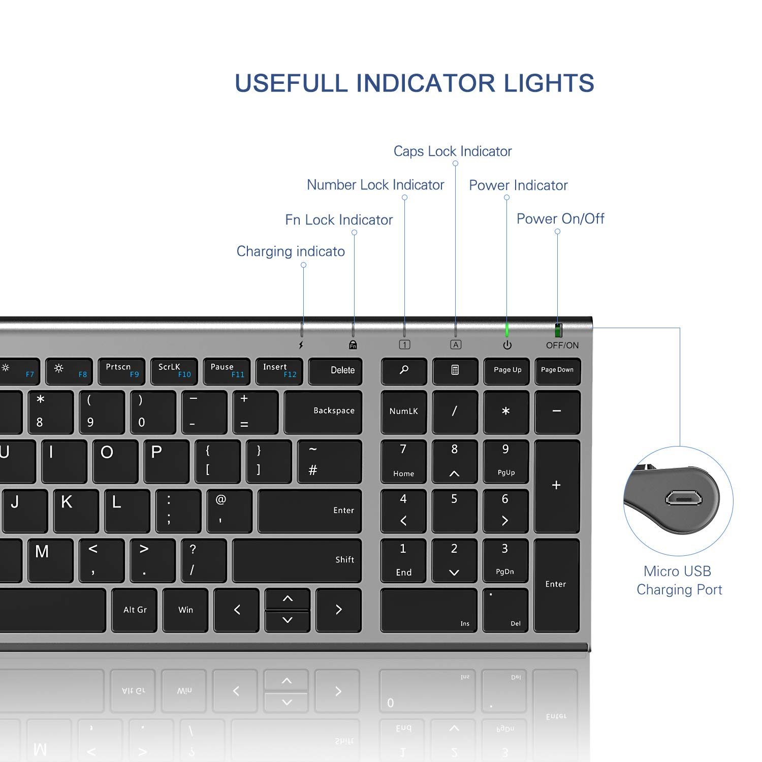 - Durable Aluminum Construction: Crafted with a robust aluminum back, the cordless keyboard ensures durability while maintaining a low-profile look. A complementary silicone cover is included to keep your keyboard clean and dust-free.
