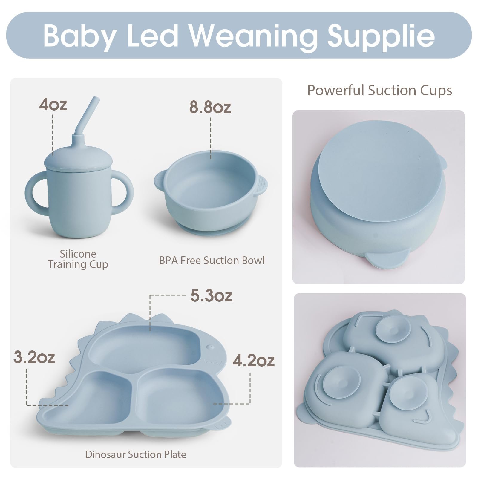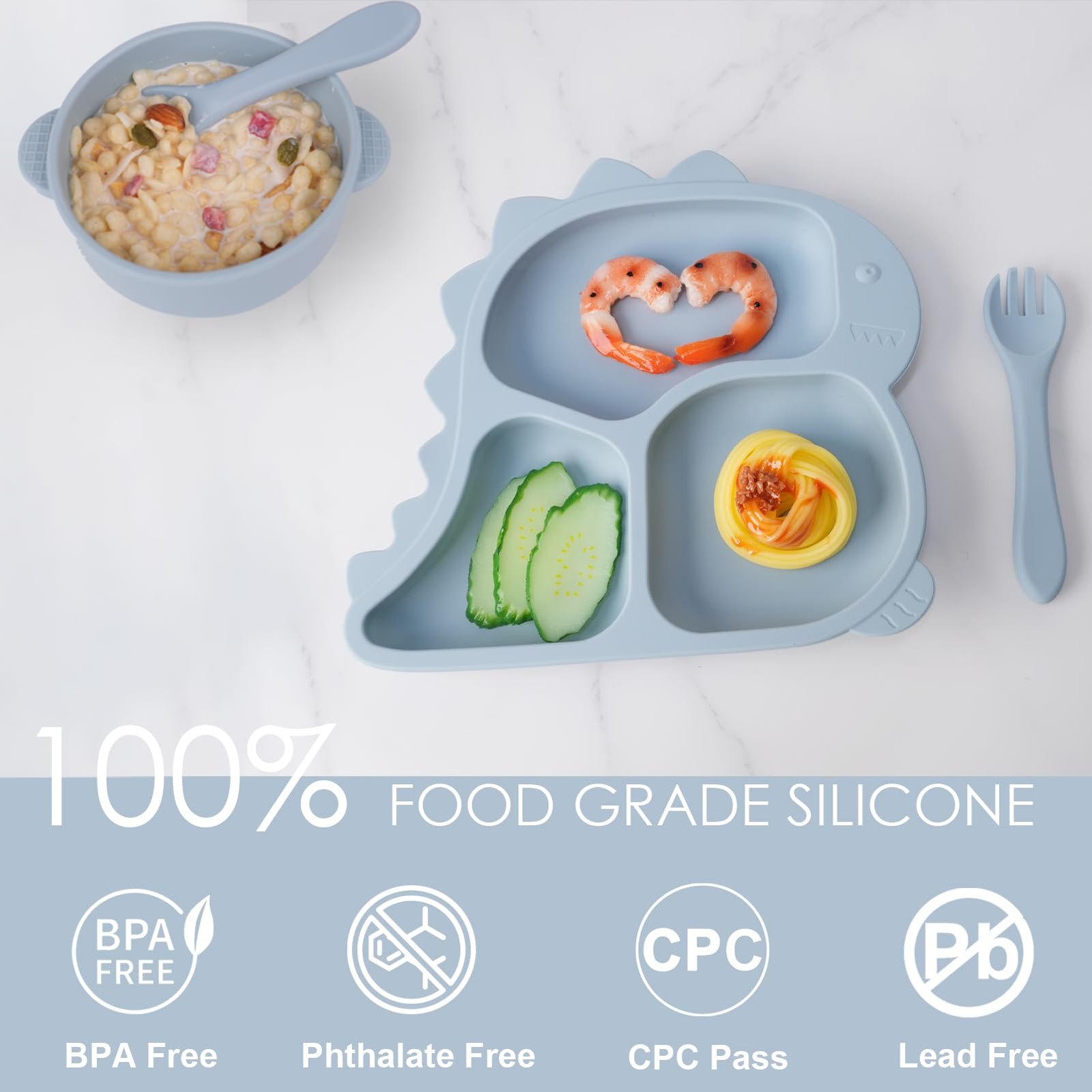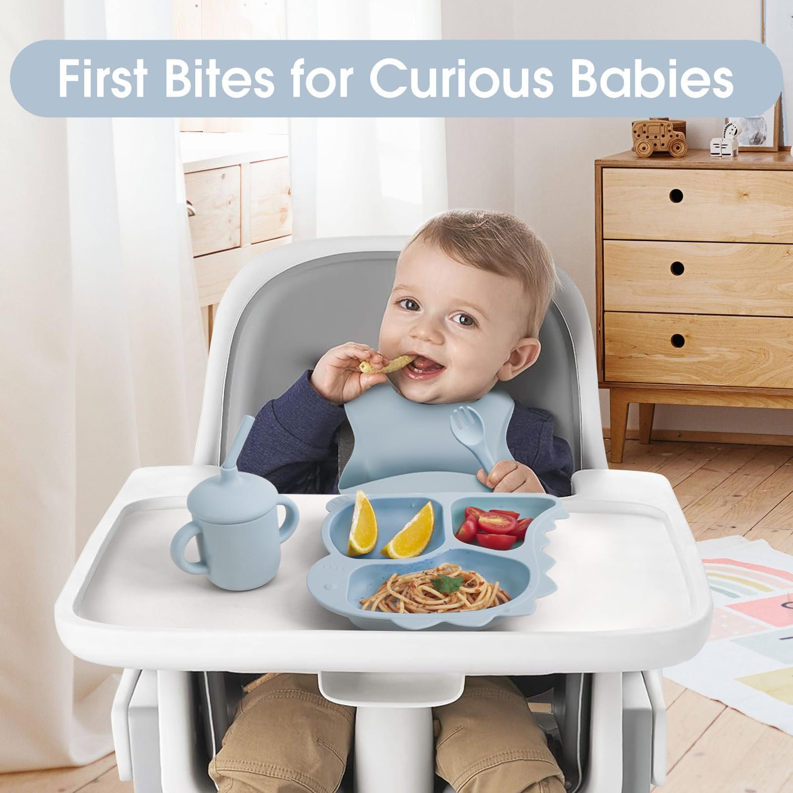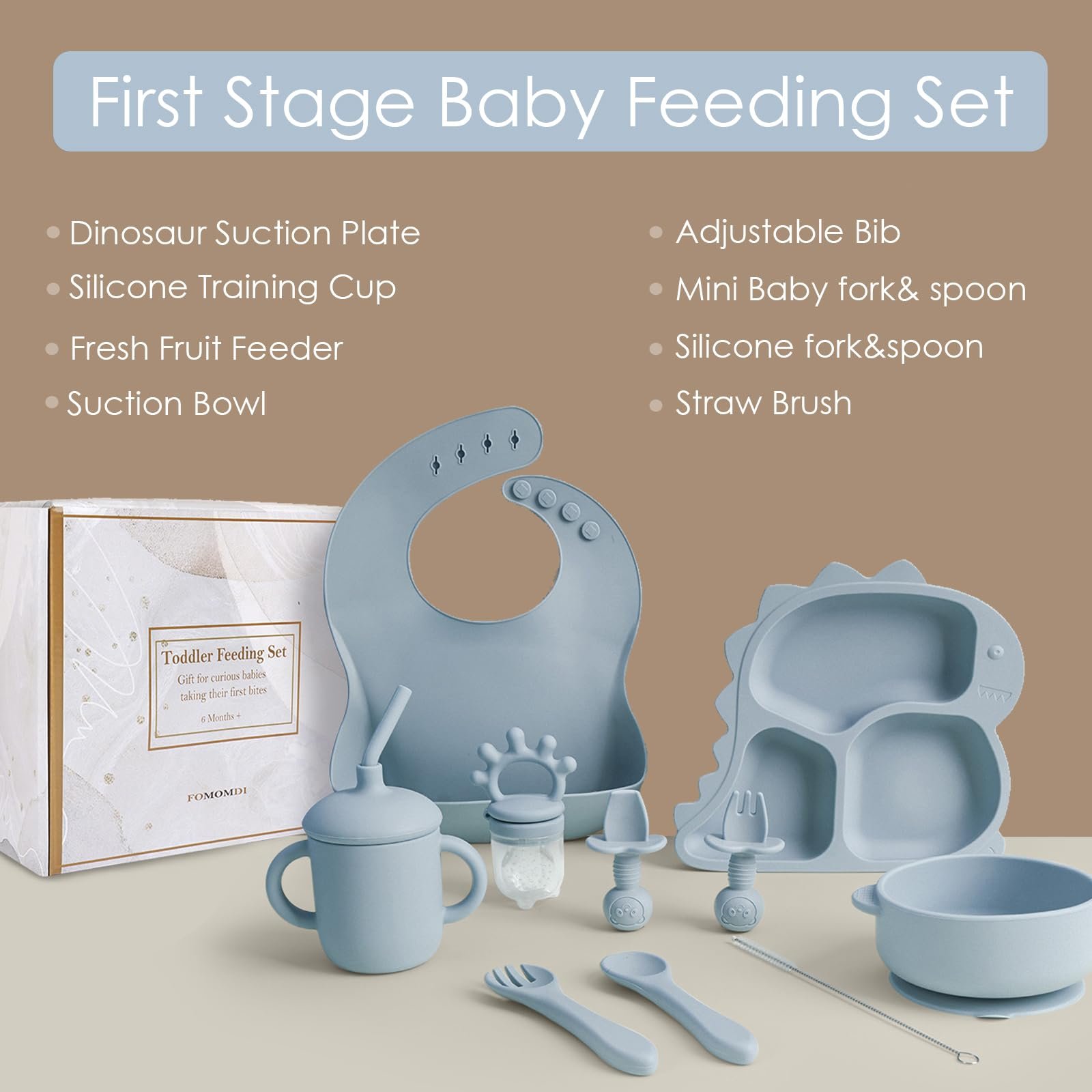 - All-in-One: The 10 piece set includes everything you need for baby led weaning including a bowl, cup, bib, baby fork, fruit feeder, straw brush, baby spoon and dinosaur plate all made of flexible, BPA free silicone