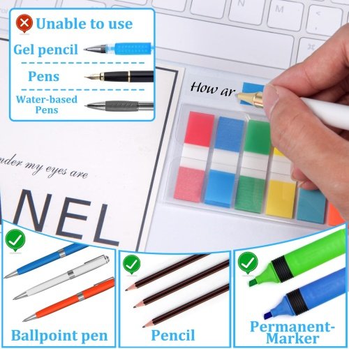 • 📖【Suggestion】:- Sticky tabs are suitable for ballpoint pens, pencils and permanent markers, but not for water-based pens or gel pens. Please make sure you choose the right type of pen to write with to avoid problems with unwriting.