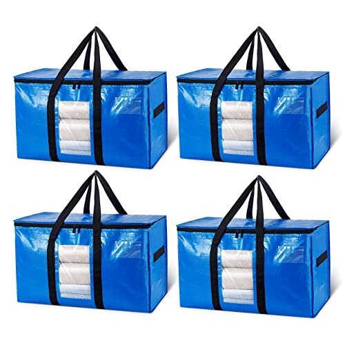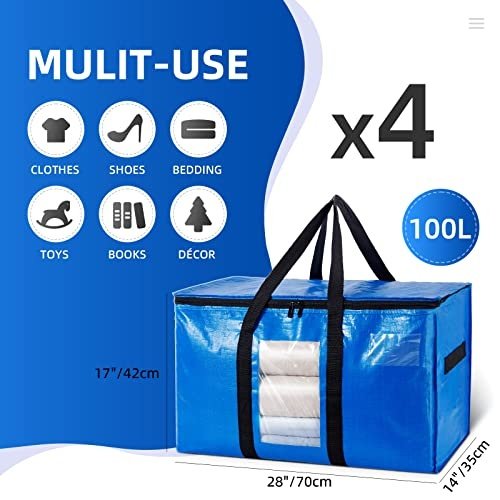 - Extra Large Size: 4 Pack heavy duty moving bags (70*42*35 cm), each jumbo storage bags with zips holds 100 litres, provides enough space for all the items you want to transport or store, Perfect for storing seasonal clothes, bedding, blankets, Pillows, quilts,toys, duvets,Christmas decorations, etc