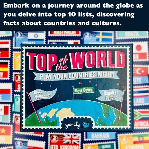 - LISTOMANIA: With over 100 top 10 lists to play, Top of the World is a game you’ll come back to again and again. From “most beer drinkers” to “happiest people” every round offers surprising insights and keeps the fun flowing. Hold your high-scoring less-common countries to return maximum points, or play it safe with countries that pop up more often, but score lower points.
