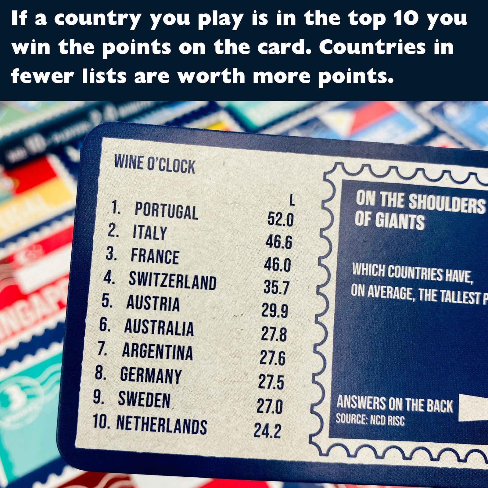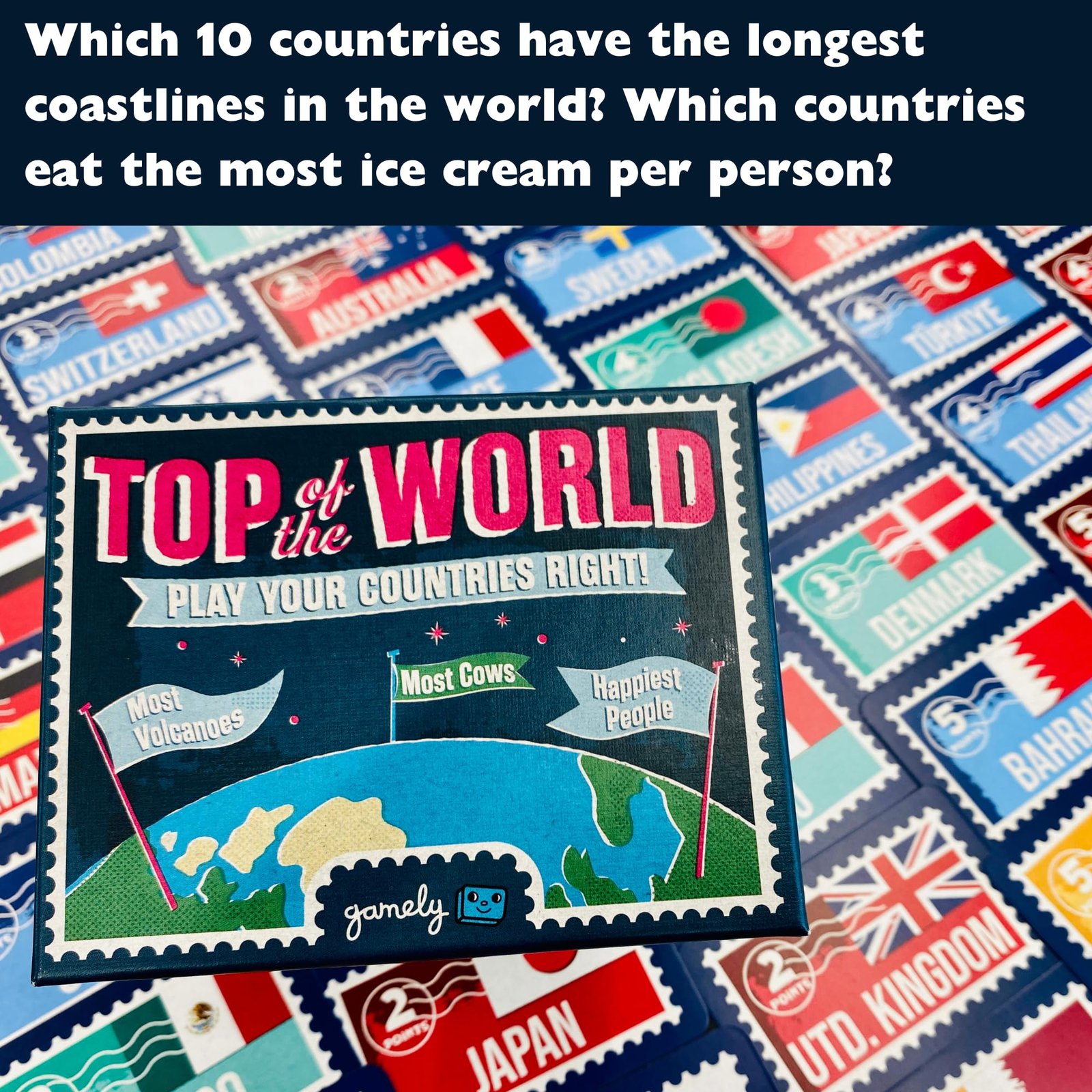- PLAY YOUR COUNTRIES RIGHT: Which 10 countries have the longest coastlines in the world? Which countries eat the most ice cream per person? And who has the best air quality? You can only use the country cards you’re dealt to answer – but play your countries right or risk being left with too many (or too few!) countries in your hand at the end.