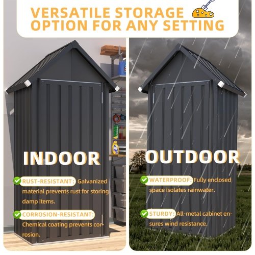 • Indoor and Outdoor Versatility: Crafted for both interior and exterior use, this outside storage cupboard made from galvanized steel, exhibits impeccable moisture and fire resistance. Weighing a robust 27.5KG, it confidently endures typical outdoor conditions, making it a reliable choice for al fresco storage.