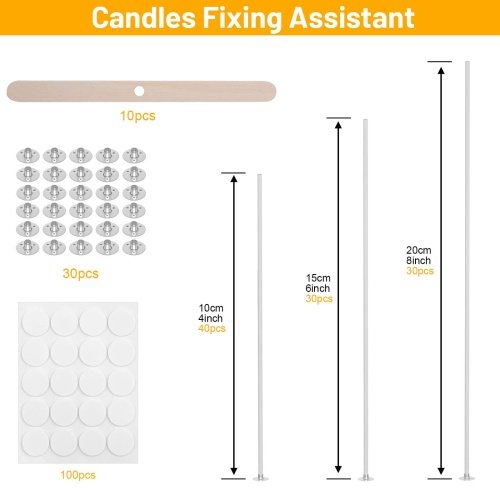 - 🕯【Value Pack】This candle making kit includes candle wicks 20cm/8″*30, 15cm/6″*30, 10cm/4″*40, candle wick holder*10, candle wick stickers*100 and wick bases*30, the perfect wick set is a great choice for making candles.