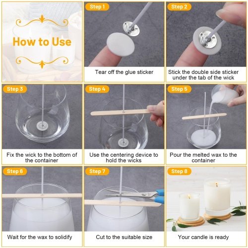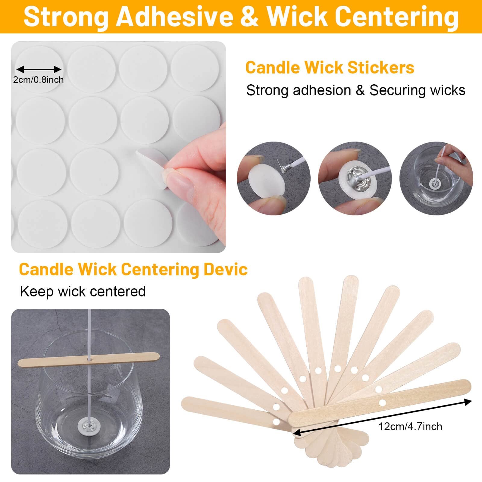 - 🕯【Easy To Use】10pcs wick holders and 200pcs candle stickers help fix the wick and keep the wick centered, when wax is poured into the candle container, they help keep the wick in an upstanding position. It is easy to operate and is the perfect starter kit for making your own candles.