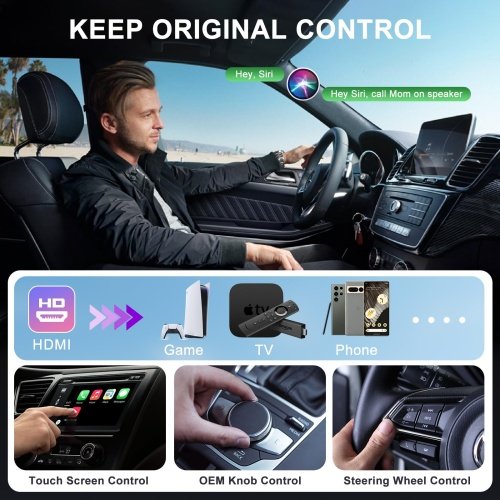 - Easy Streaming Experience: Our this wireless carplay HDMI adapter support mirroring multimedia devices using the in-car HDMI port, quickly connect compatible Fire TV stick, Google TV, game consoles, smartphones, tablets, Macbooks and other DP-enabled multimedia devices. Enjoy unparalleled flexibility. Enhance your car for versatile in-car entertainment. (Connect the dongle – Select “HD” – Connect a multimedia device with an HDMI port directly to the adapter or via an HDMI cable)