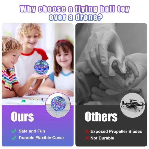 - [Protective Cage & Lightweight] The flying ball has a cage, which is made up of high grade ABS material, which is lightweight, flexible, drop resistant and encloses propellers and also the upgraded mesh shell layers causes no harm to your children’s fingers.